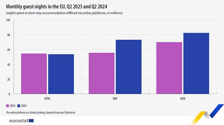 In April of this year, 53.5 million nights were spent in accommodation booked via online platforms, showing a slight decline of 1.8 percent compared with April 2023. However, May registered an increase with 73.0 million nights booked via platforms (+31.7 percent compared with May 2023) as well as June, with 82.3 million (+17.8 percent compared with June 2023).